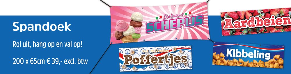 Met een spandoek weet je zeker dat je gezien wordt. Makkelijk op te rollen en in een paar tellen opgehangen. Enkelzijdig bedrukt op stevig zeildoek en rondom voorzien van ophangringen. Verkrijgbaar in 2 formaten; 200 x 65cm of 300 x 100cm