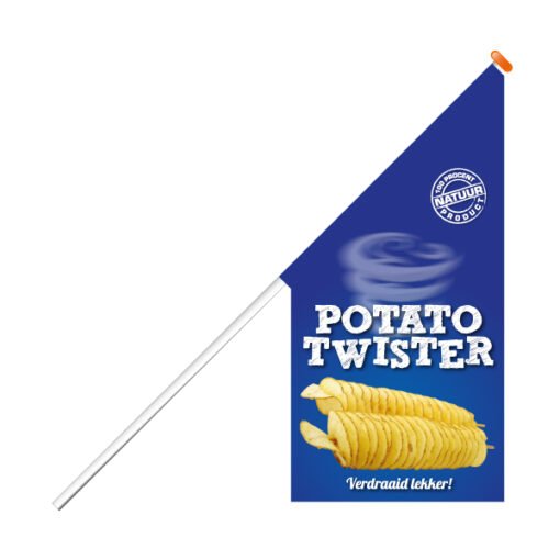 Met deze vrolijke potato twister kioskvlag kun je op creatieve wijze indruk maken in de winkelstraat. Hang de kioskvlag op aan de gevel of de kraam en ze trekken de volle aandacht.